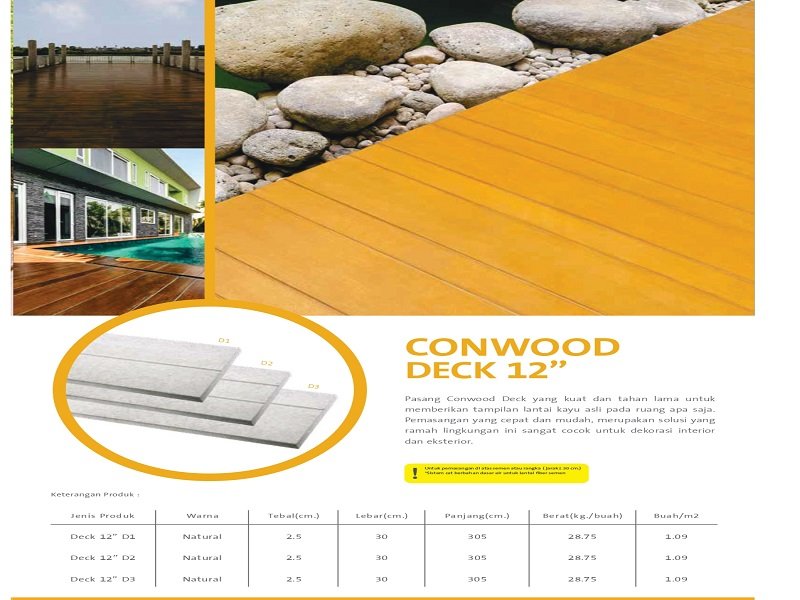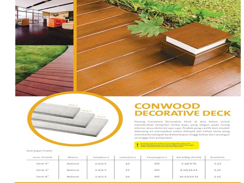 Buat lantai rumah anda bernuansa lantai kayu dengan menggunakan produk dekorasi lantai dari Conwood, produk alternatif kayu, yang kuat dan mudah digunakan. Selain kuat dan mudah digunakan, produk lantai dari Conwood dapat memberikan tampilan lantai kayu yang elegan pada semua ruang interior maupun eksterior. Produk ini merupakan solusi terbaik dan tahan lama yang dapat membantu daerah berkelembaban tinggi dan bebas dari serangan serangga dan pelapukan.dekorasi.